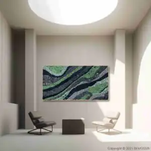 Die Kombination aus verschiedenen Grüntönen, Dunkelblau und Grau schafft ein interessantes und dynamisches Muster, das an natürliche Landschaften erinnert und dem Raum Ruhe verleiht, gleichzeitig jedoch Energie spendet. Dieses Bild ist hypoallergen und ökologisch, was es zu einer idealen Ergänzung für ein gesundes und nachhaltiges Umfeld macht. Aufgrund seiner akustischen Eigenschaften trägt es auch zur Verbesserung der Klangqualität im Raum bei.