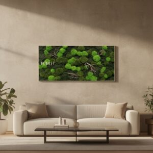 Durch die rechteckige Form eignet sich das Moosbild ideal als stilvoller Blickfang für Wohnräume, Büros oder Empfangsbereiche. Die Kombination aus Moos und Holz macht jedes Exemplar zu einem einzigartigen Unikat mit natürlichem Charakter. Perfekt für alle, die eine moderne Wandgestaltung mit natürlicher Wärme suchen.