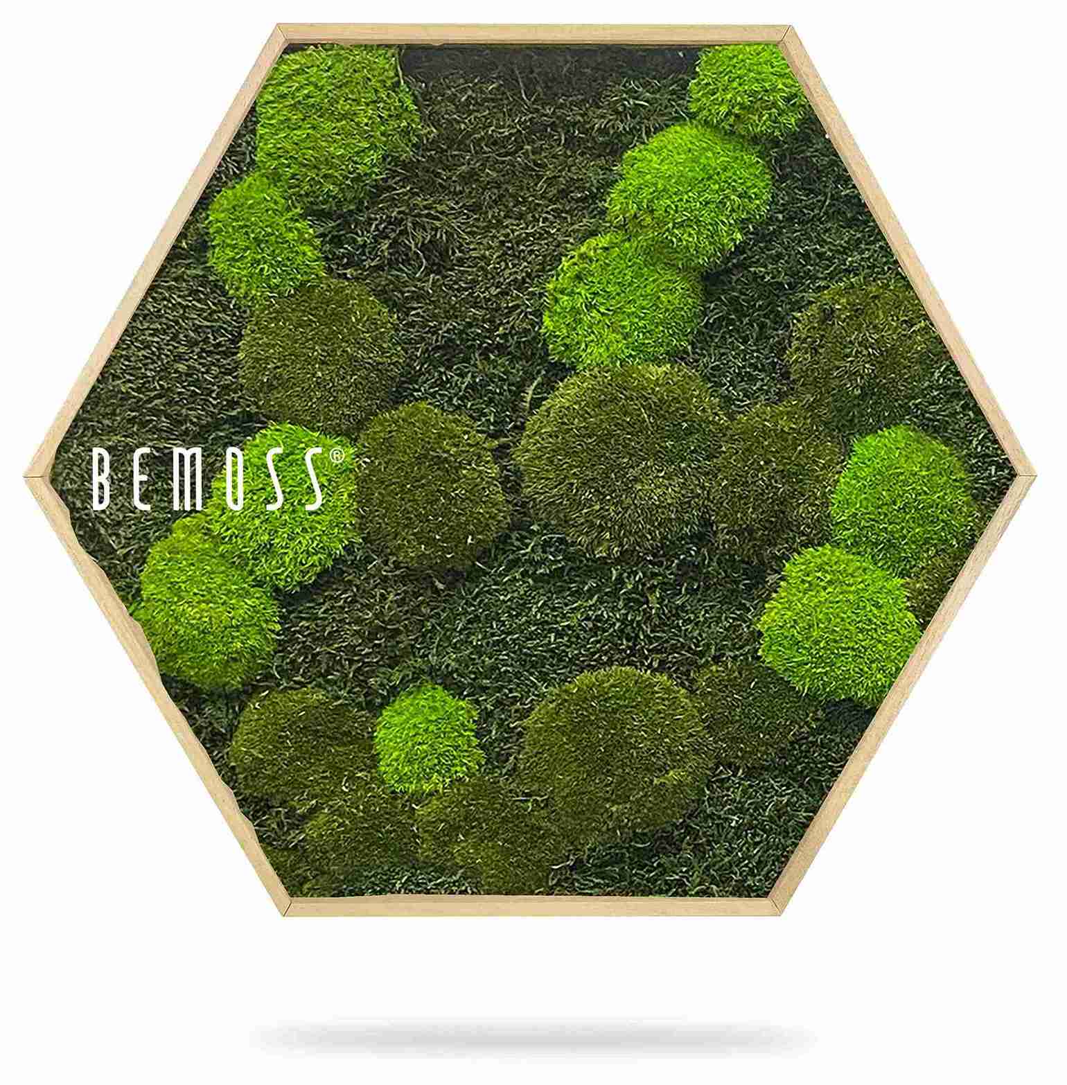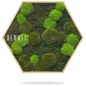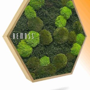 Moosbild Hexagon FLACHMOOS & KUGELMOOS Doven mono verbindet natürliche Materialien mit präziser Formgebung. Die Kombination aus flächigem Moos und sanft gerundeten Moospolstern erzeugt eine ruhige, strukturierte Oberfläche, die durch die markante Hexagonform modern interpretiert wird. Die abgestimmten Grüntöne sorgen für eine ausgewogene und zeitlose Wirkung.