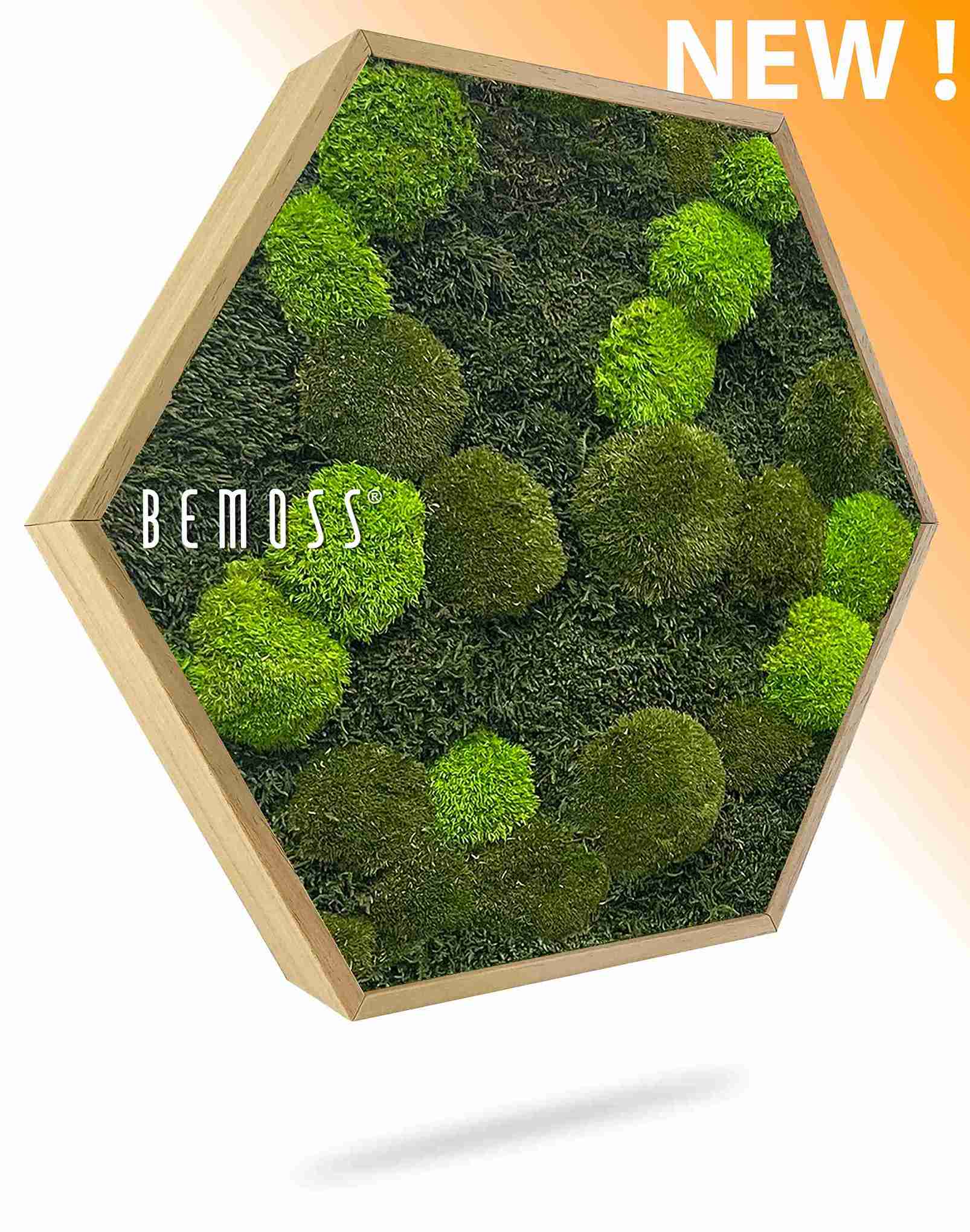 Moosbild Hexagon FLACHMOOS & KUGELMOOS Doven mono kombiniert Flachmoos und Kugelmoos in ruhigen Grüntönen und setzt mit seiner sechseckigen Form einen modernen Akzent. Die klare Geometrie trifft auf natürliche Strukturen, während das Bild aus 100% natürlichem stabilisiertem Moos besteht, pflegefrei ist und handgefertigt in Deutschland wurde.