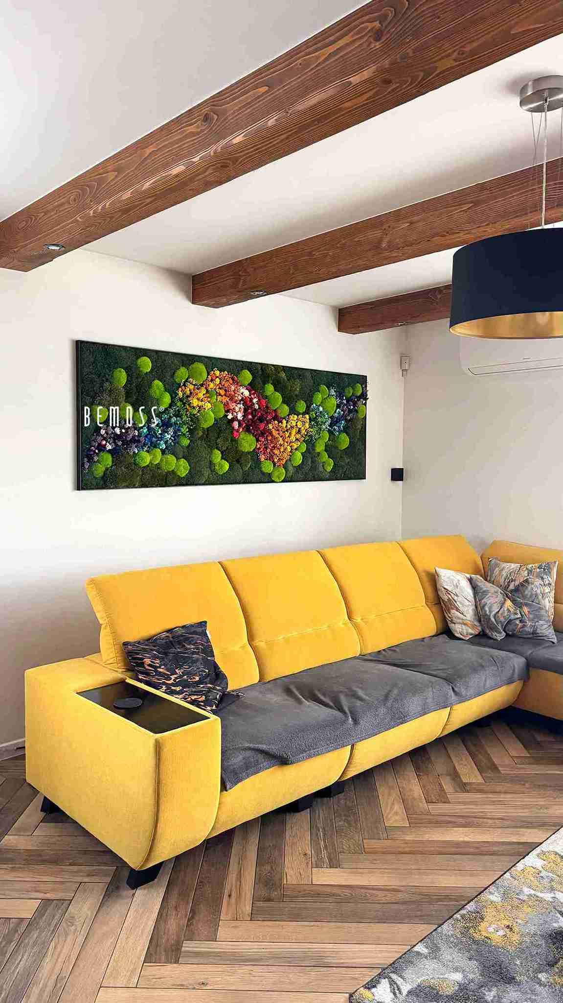 Moosbild PFLANZEN Acebo ist eine Feier der Natur in all ihren Farben. Die reichen grünen Flächen des stabilisierten Mooses werden durch eine bunte Palette von Blumen ergänzt, die das Gefühl eines Spaziergangs über eine Blumenwiese erzeugen. Die Kombination von sattem Grün mit sanften und lebhaften Farbtönen der Blumen belebt jeden Raum und bringt verspielte Eleganz.