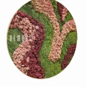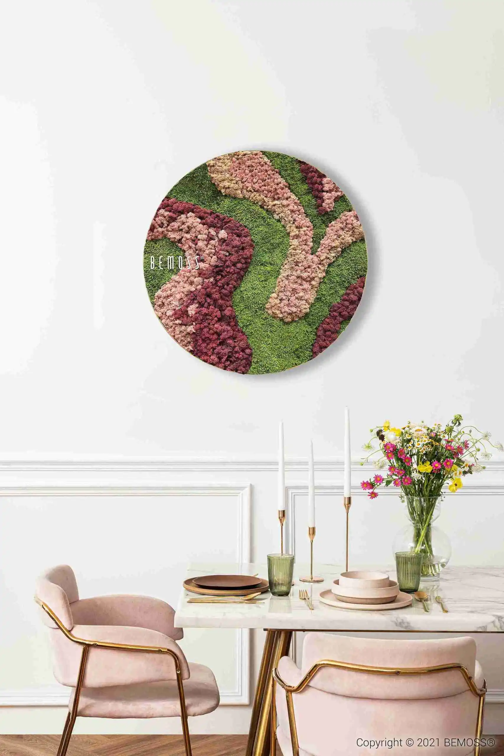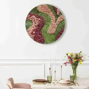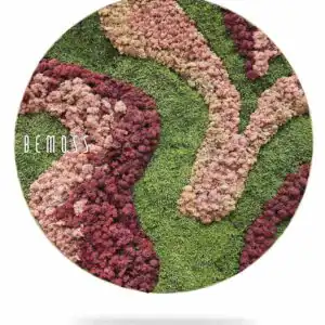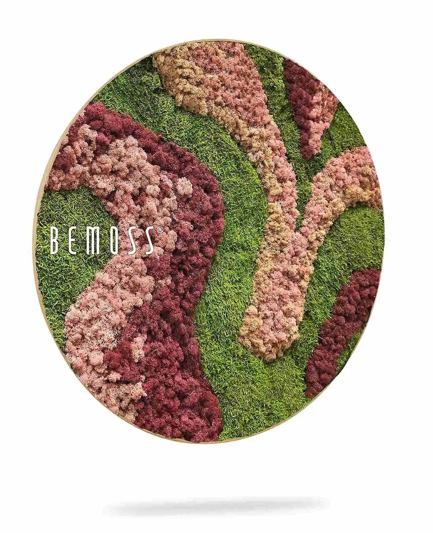 Moosbild Rund BEMOSS® ORTHO ARROSA ist die perfekte Wahl für alle, die auf der Suche nach einer originellen natürlichen Dekoration sind. Zarte Rosé- und Bordeauxtöne fließen in sanfte Formen, die an einen farbenfrohen Blumen-Teppich erinnern. Der grüne Hintergrund verleiht dem Bild Frische und hebt seine natürliche Schönheit noch mehr hervor.