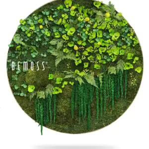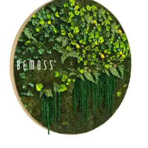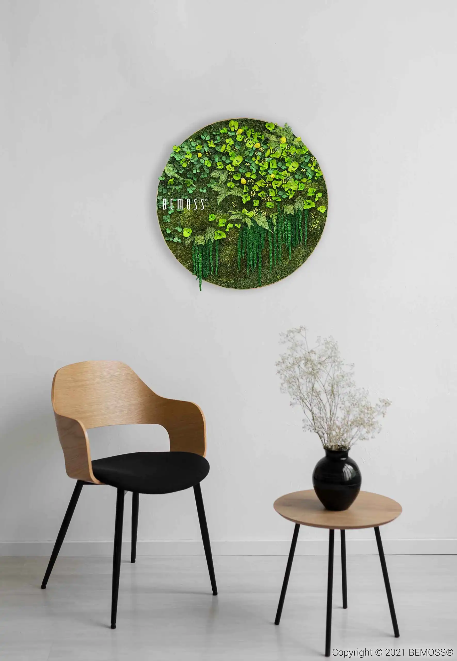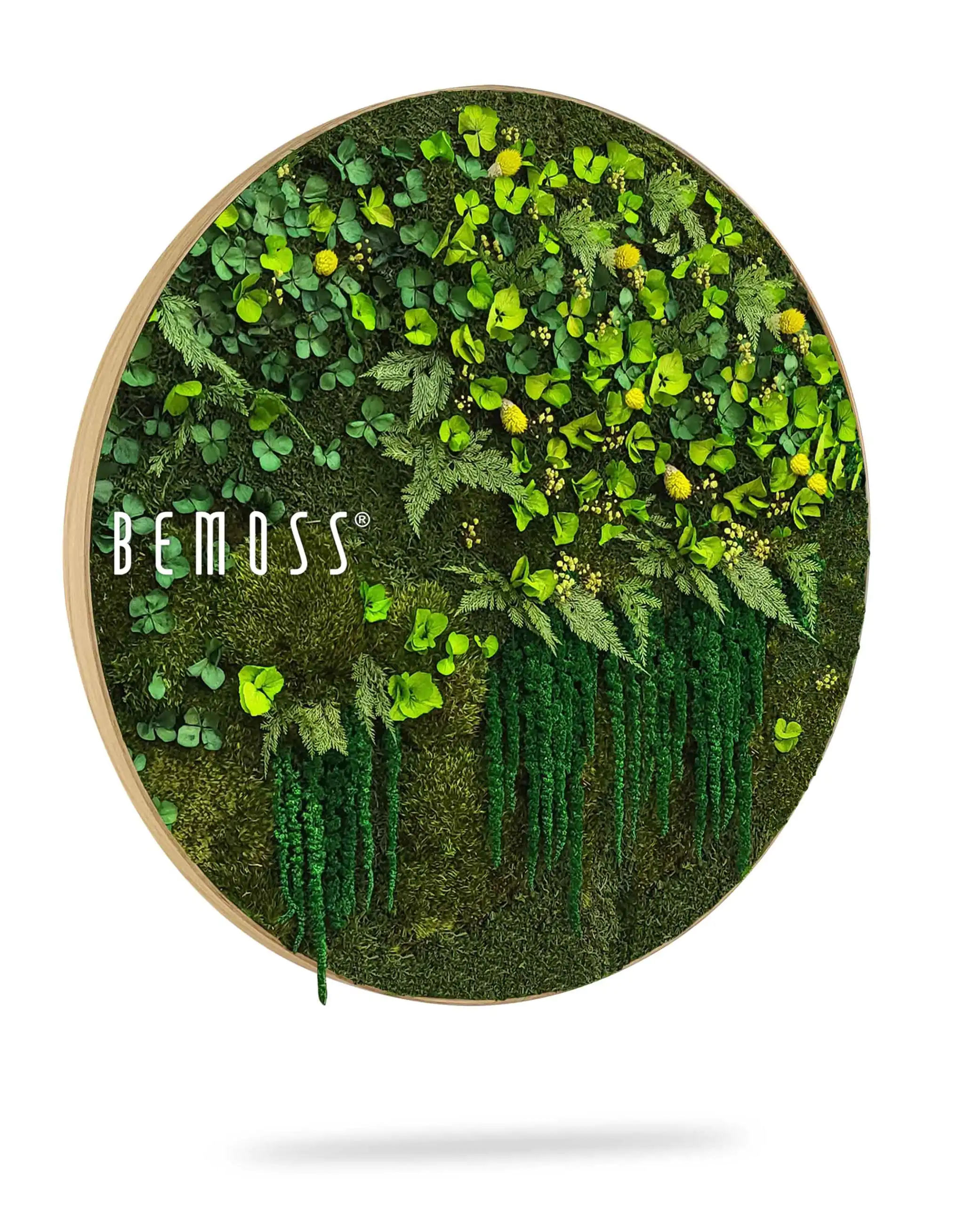 Genießen Sie die natürliche Ruhe, die das Moosbild Rund PFLANZEN Lomo in Ihr Zuhause bringt. Die Kombination aus hängenden Details und frischem Grün erinnert an Waldecken und schafft eine einzigartige Verbindung von Kunst und Natur. Erhältlich in verschiedenen Größen, auch maßgeschneidert, um perfekt in Ihren Raum zu passen.
