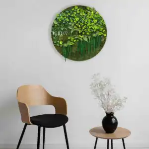 Das Moosbild Rund PFLANZEN Lomo verbindet modernes Design mit dem Zauber der Natur. Das lebendige Grün des stabilisierten Mooses steht im Kontrast zu elegant herabhängenden Pflanzenelementen, die das Gefühl eines sich bewegenden Waldes hervorrufen. Feine Details und zarte Farbtöne schaffen eine dynamische Komposition, die sofort ins Auge fällt und jeden Raum belebt.